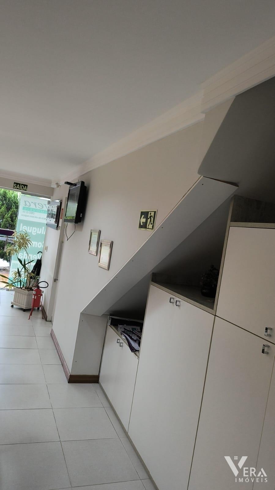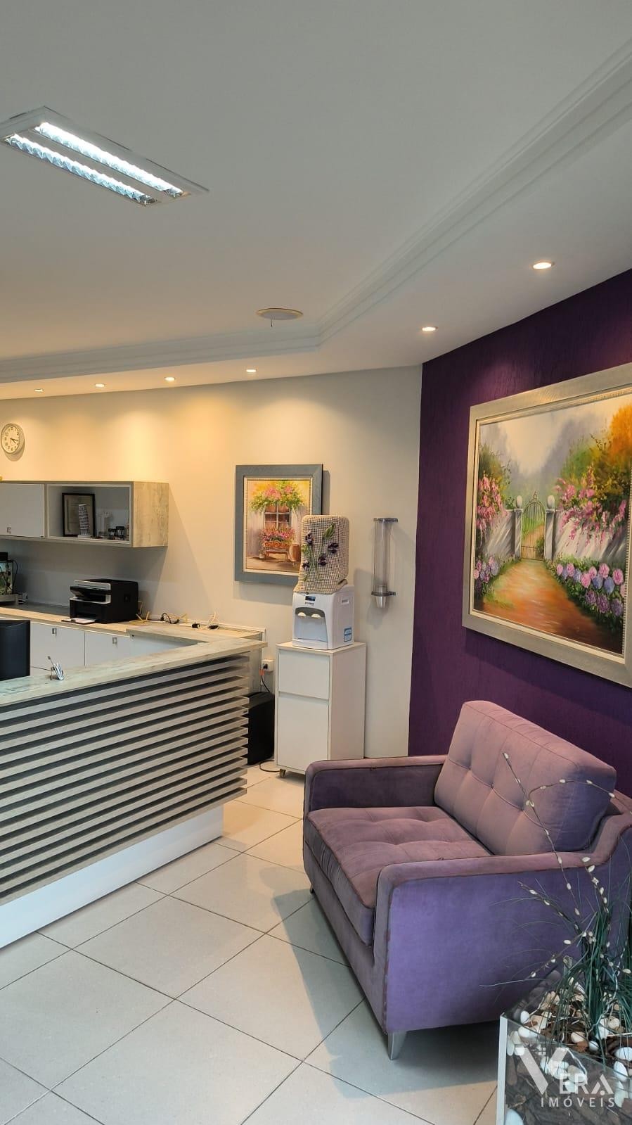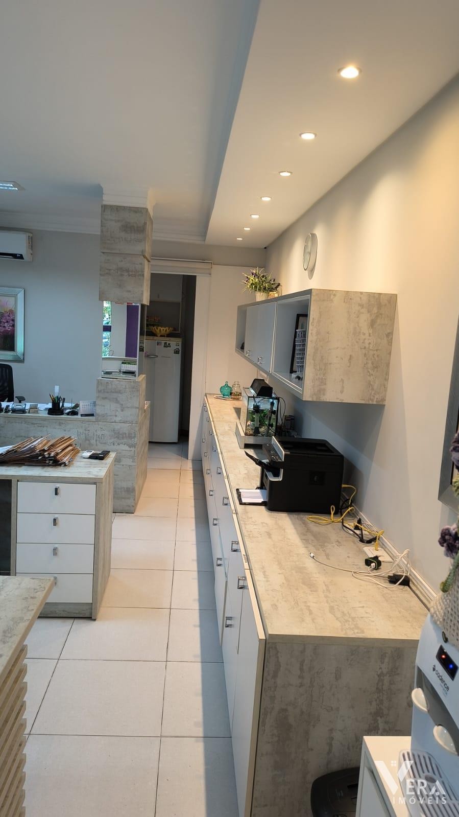 Espaço comercial mobiliado com móveis planejados, recepção, três mesas de atendimento, arquivo, armários e cozinha planejada com refrigerador. Conta ainda com um banheiro, ideal para quem busca praticidade e funcionalidade em um ambiente bem equipado.