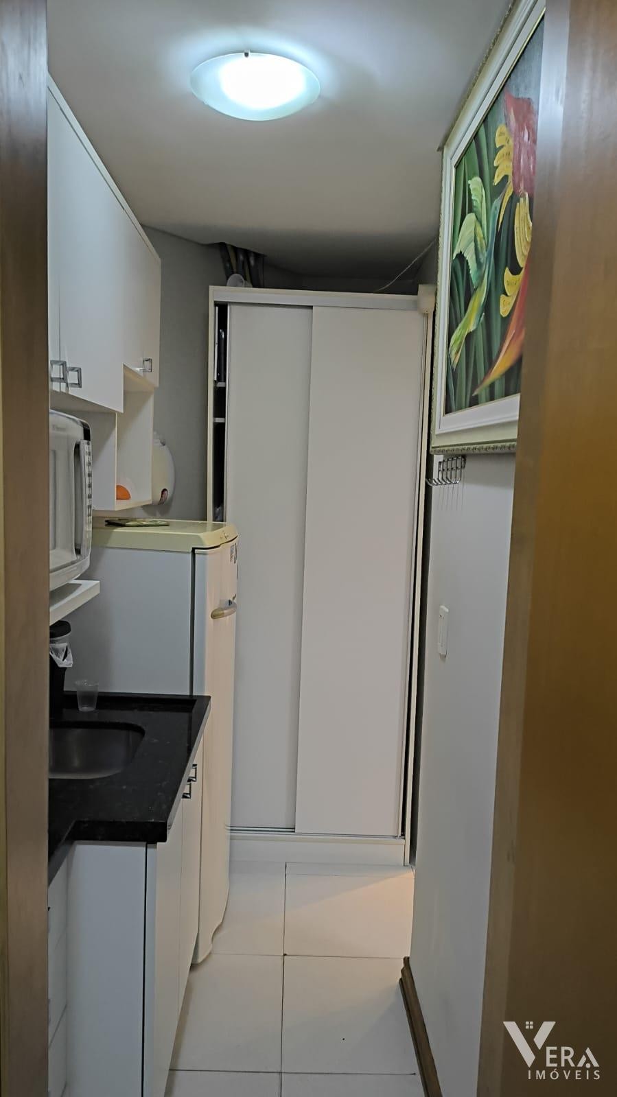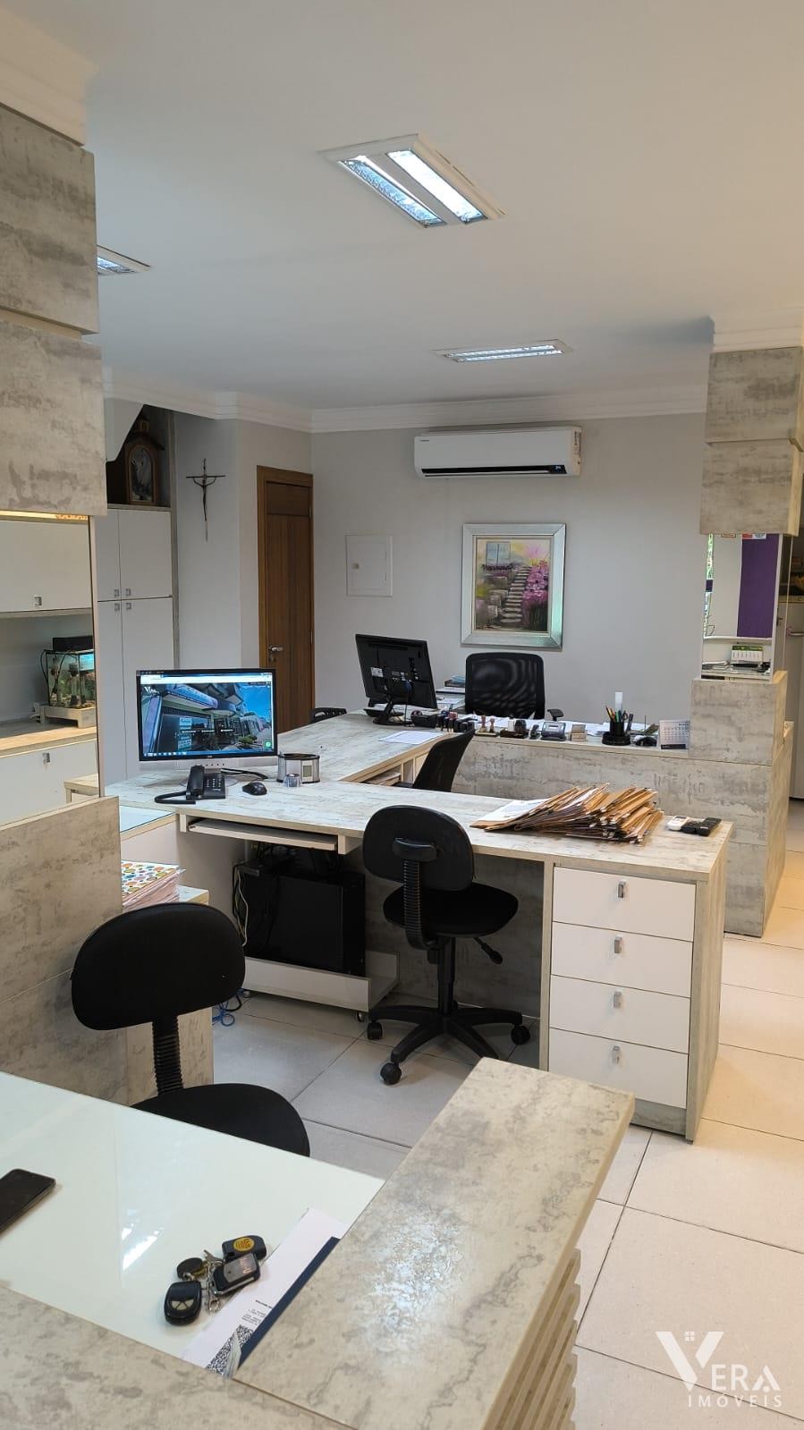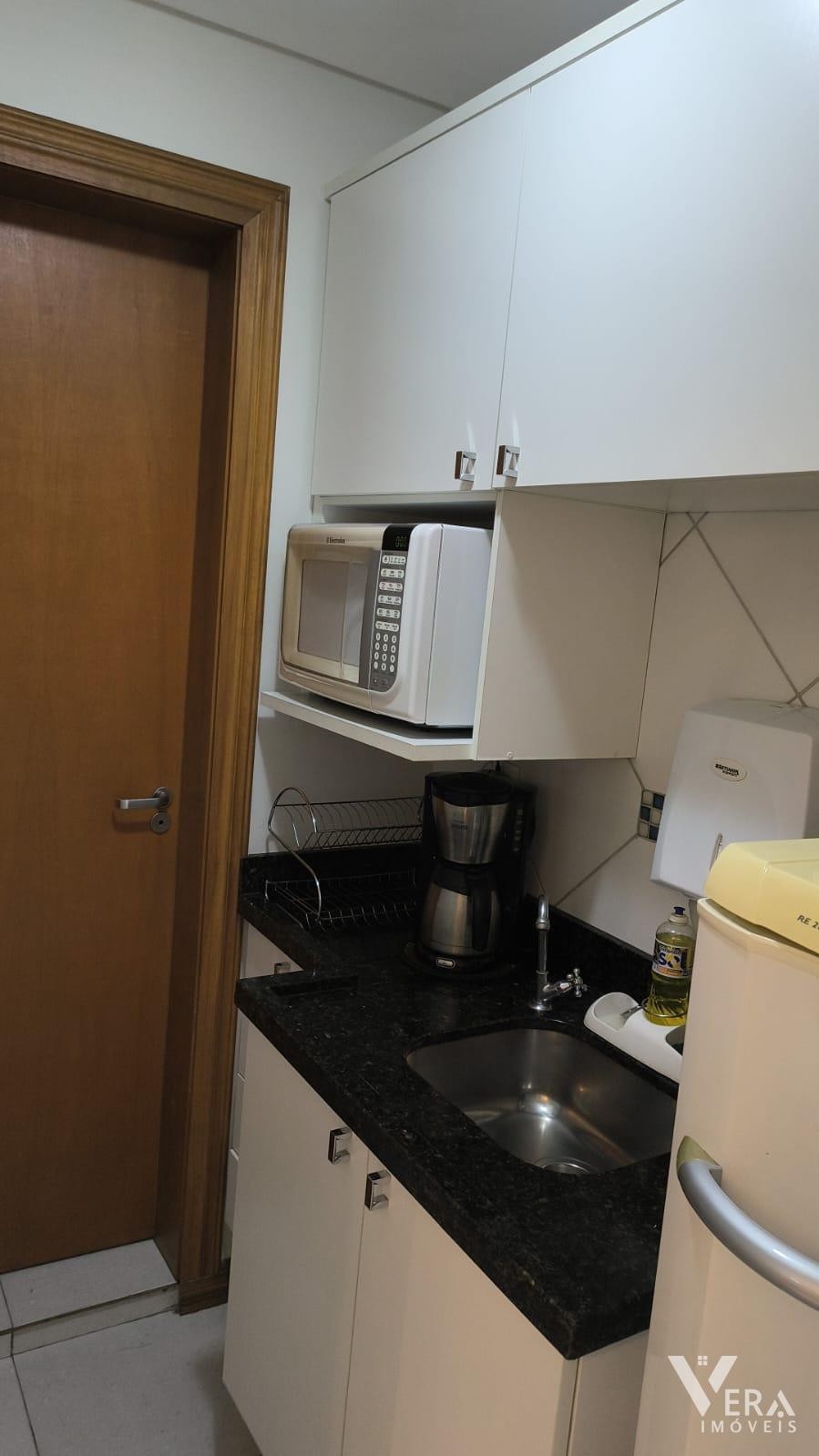 Espaço comercial mobiliado com móveis planejados, recepção, três mesas de atendimento, arquivo, armários e cozinha planejada com refrigerador. Conta ainda com um banheiro, ideal para quem busca praticidade e funcionalidade em um ambiente bem equipado.